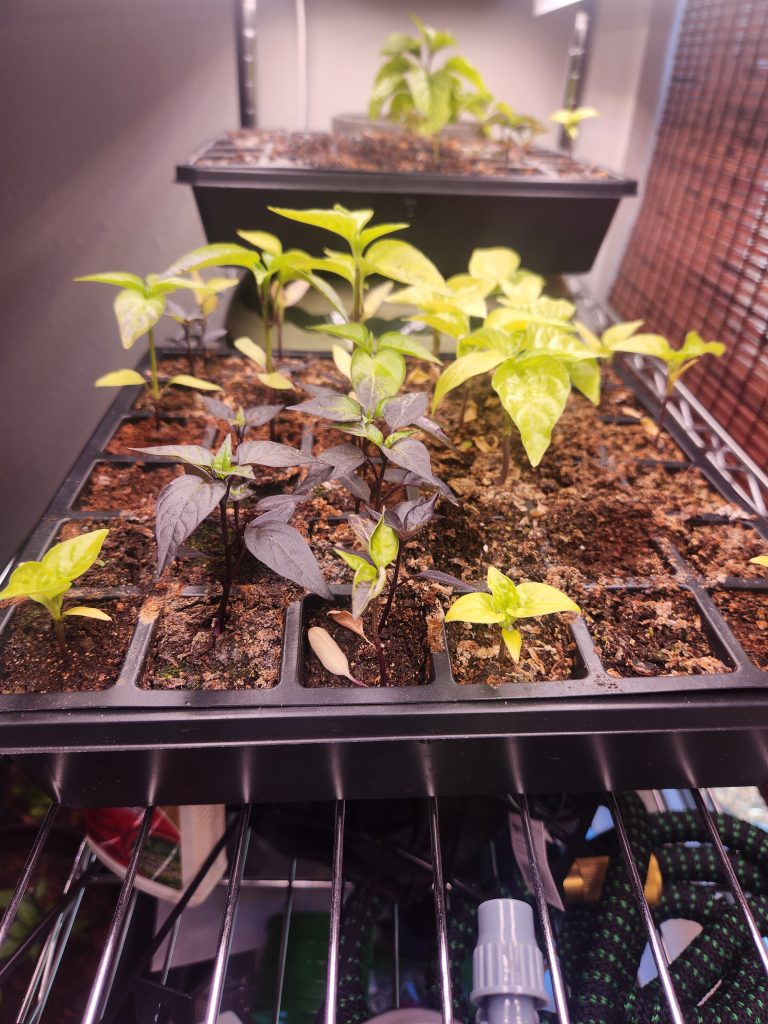 Each year our plants are started from seed at the beginning of January to be ready to plant in early April. Due to the moderate temperatures plans will produce through December! This years varieties include Peach Sugar Rush, Chocolate Trinidad 7 Pot, and Yellow Jolokia.