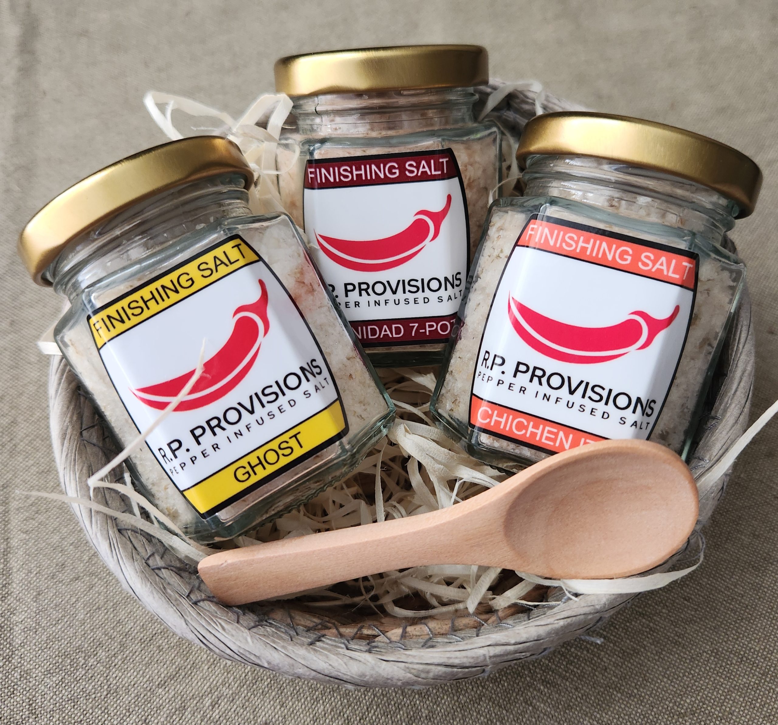 This limited time gift pack includes three of our flavors, Chichen Itza, Trinidad 7-Pot, and Ghost in a woven basket with a wooden serving spoon.
